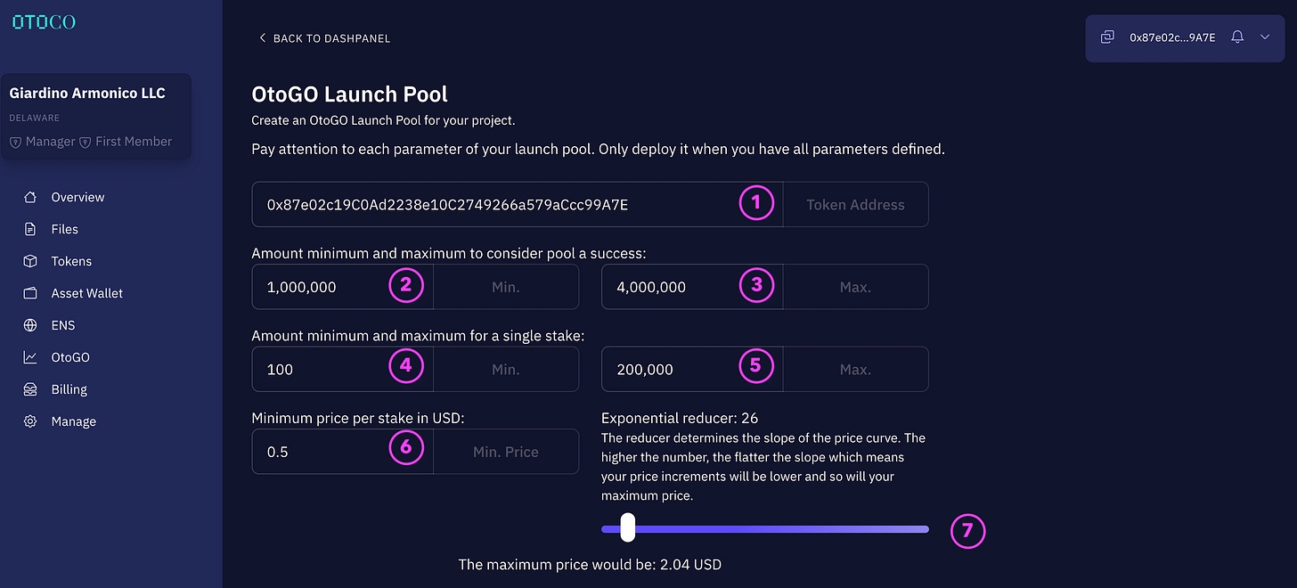 In the example above, with the minimum price per token set at USD 0.5 and the reducer set to 26, the price will gradually increase along a sloping curve to a maximum of USD 2.04 per token as the pool fills.
