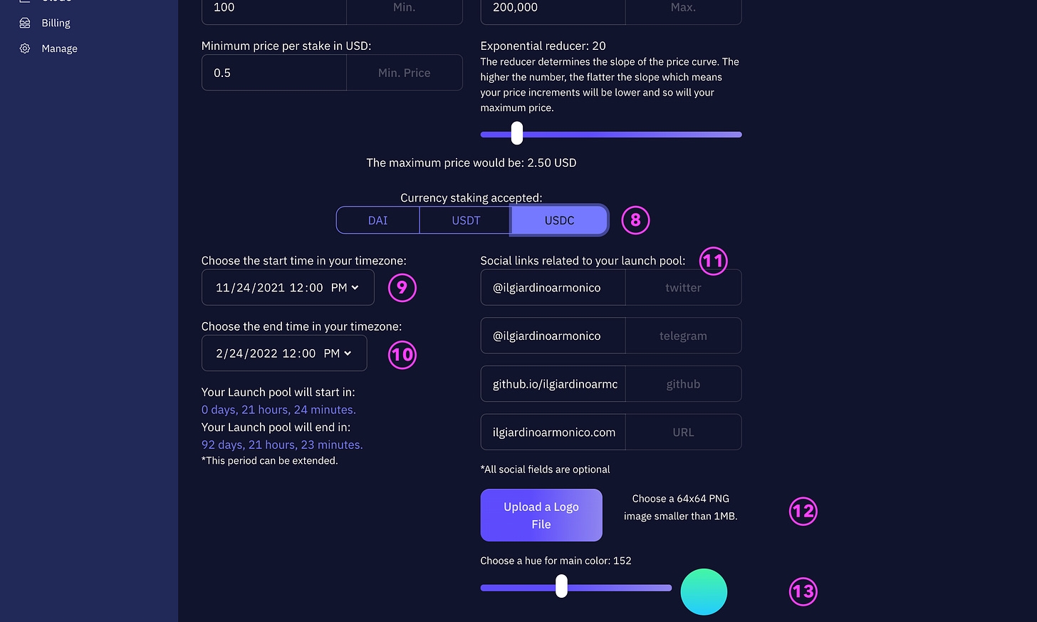 We had a bit of fund with this feature :-). You can slide across the color spectrum and we then pair your chosen color with a second color to get to a matching gradient for your launchpool page.