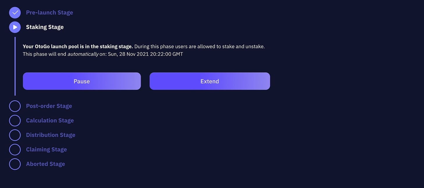 pauseandunpauseyour Staking Stage at any time. Nobody can stake when your launchpool is paused but people can still unstake. If the hardcap is not reached, the project sponsor can choose toextendthe launchpool by a chosen number of days. Staking and unstaking then continues during the extension. Note that theextendfunction has to be called before the end date.Post-order Stage When the end date is reached, and provided the soft cap has been reached, the Sponsor can call the